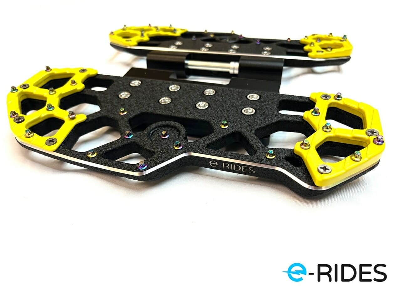 This is the e-RIDES Honey comb removable pedals, code name wolverine. The e-RIDES two piece Honeycomb spike pedals are made out of the same alloy material used by Apple for iphones. The e-RIDES honey comb pedals are CNC cut, adjustable incline with heel and toe assist