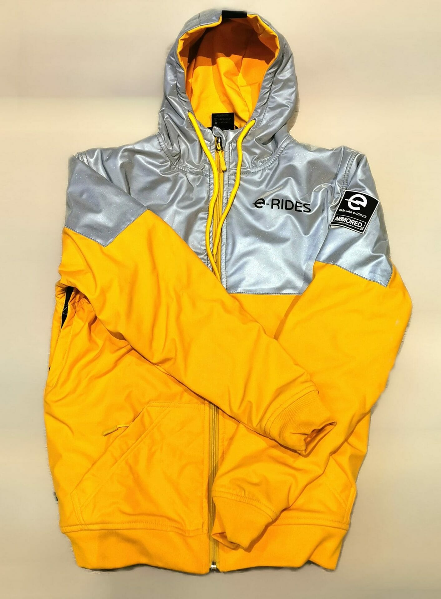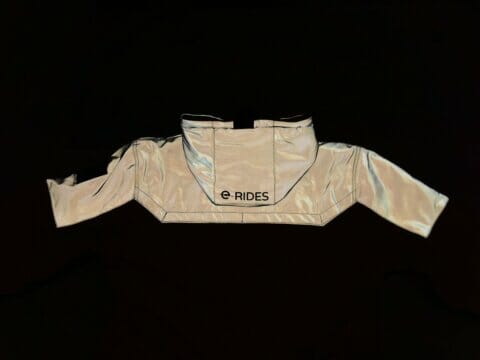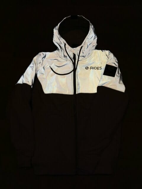This is the e-RIDES ARMORED reflective jacket with Chest protector, designed in partnership with LAZYROLLING. Comes in e-RIDES traditional Yellow, Hot Pink, Blue and Arctic White.