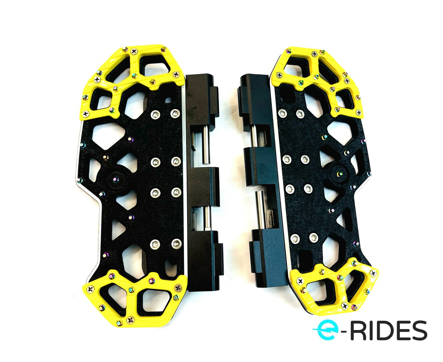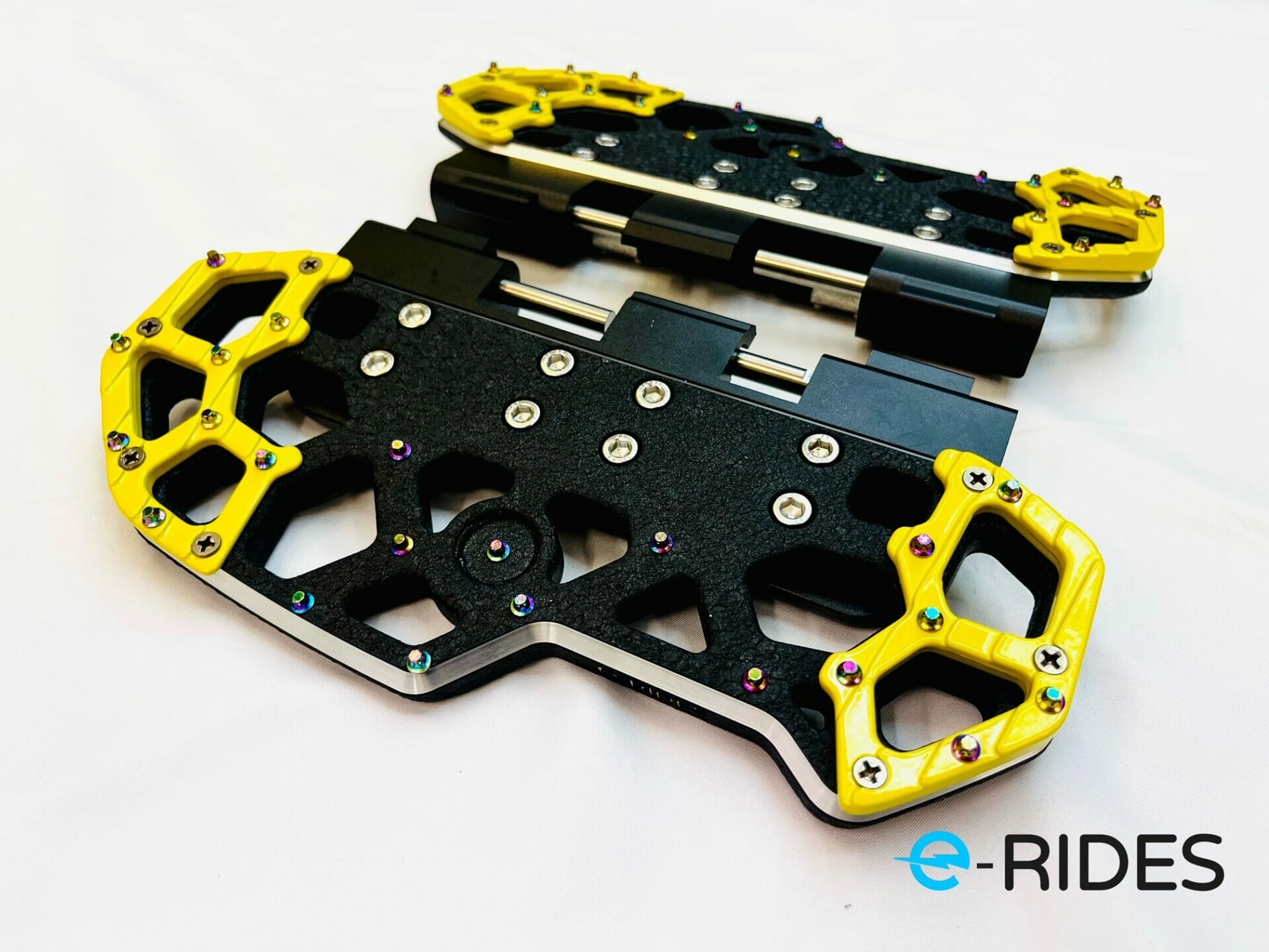 The e-RIDES two piece Honeycomb spike pedals are made out of the same alloy material like the ones used by Apple for iphones. The e-RIDES honey comb pedals are CNC cut, adjustable incline with heel and toe assist.